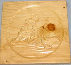 Calf Roper, Horse, calf and rider. dished edge carving. Keyhole slots for hanging. Ponderosa Pine with a clear finish.